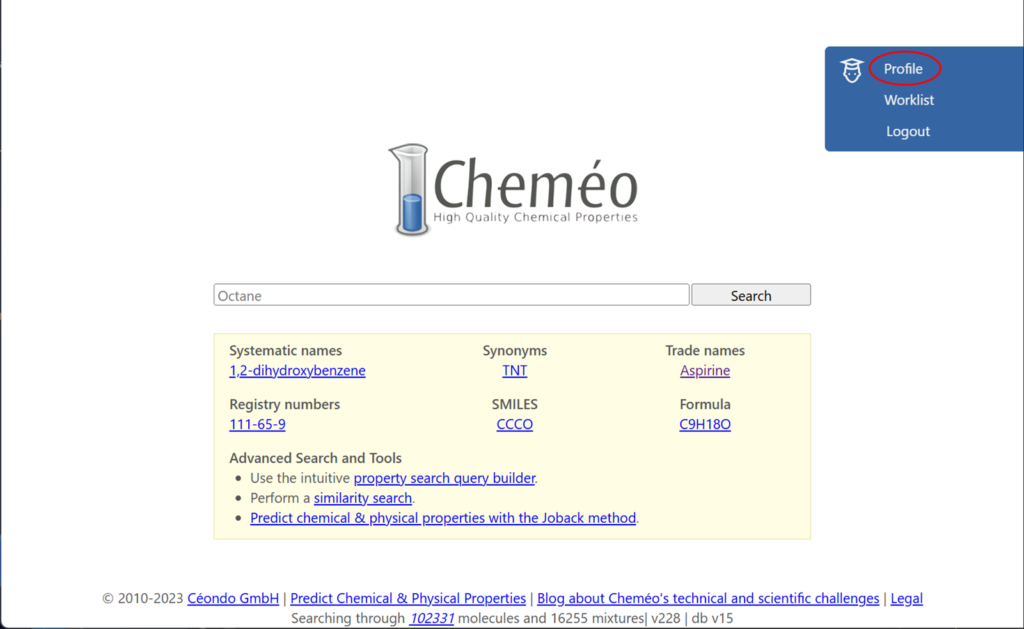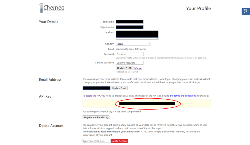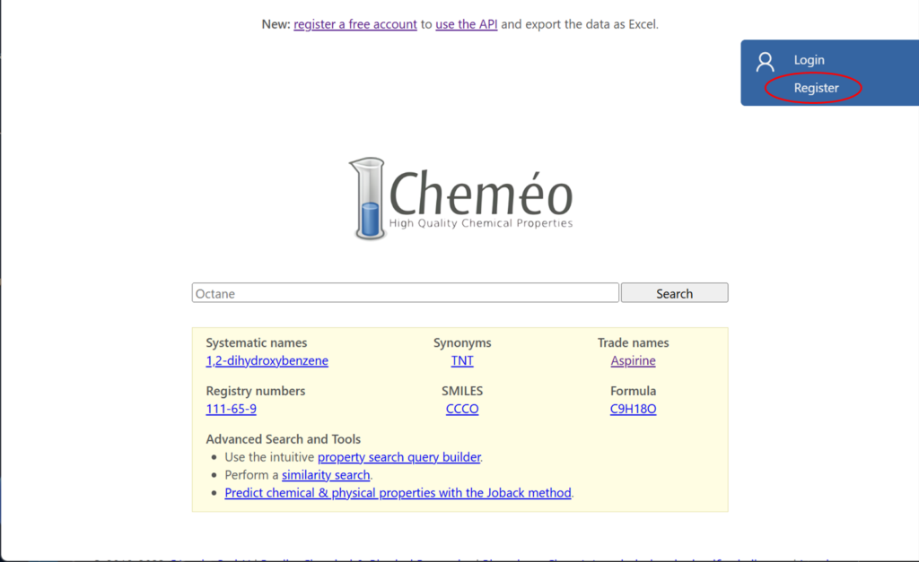 データベースの一つであるCheméoからはAPIを経由して情報を取得していますので、先にAPIを取得します。https://www.chemeo.com/ にアクセスし、右上のメニューからRegisterをクリックし登録します。